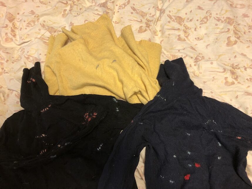 これは何かと言いますと、黄色一枚と黒二枚の、どれもカシミアのセーターです。めちゃくちゃ虫に食われてしまって、まともな人ならなんぼなんでも、即捨てます。黒のセーターなんて、他にも下手すりゃ十枚近くあるのだし。