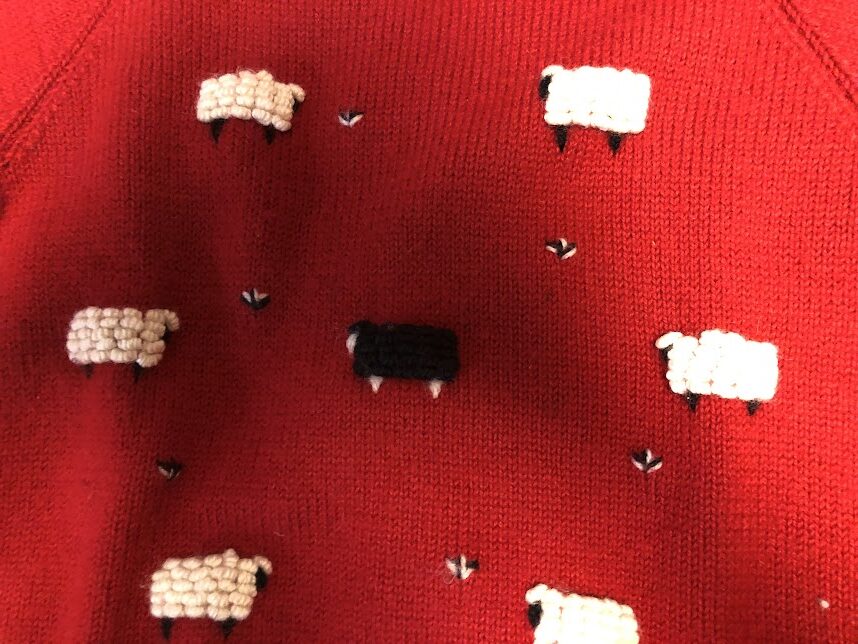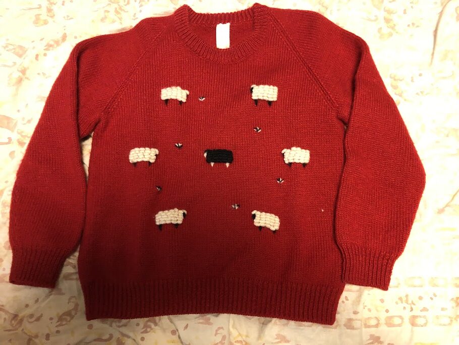 このセーターは、母がヒツジ、私がキウイのを自分用に買ったのです。どこのお店でどうして買ったのかはふしぎなほどに覚えていない。母は他にもウールのピンクのスカートを買ったのですが、ホテルで試着したら似合わなくて、私がもらいました。これも温かで軽くて冬には重宝しています。ひょっとしたら、セーターといっしょに最後まで残すかな?ヒツジのセーターも母が亡くなったあとは私のものになりました。 (2025.4.27.)