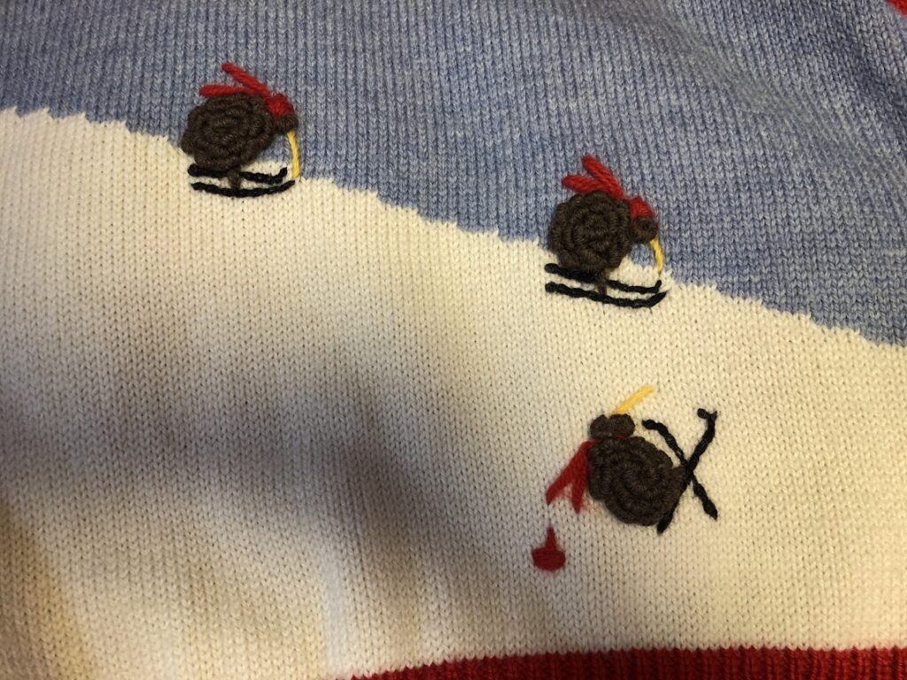 ヒツジはニュージーランドには多くて、キウイは国鳥です。セーターの模様、ヒツジはわかりますが、キウイは何だかわからないよねー。赤い帽子とえりまきをして、スキーをしてるらしいんですが。すっころんだ一羽は、帽子がはずれて飛んでます。そんなところが無駄に細かい。