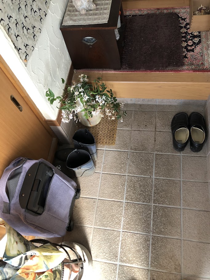 別にいいんだけど、そうしたら、その次の日、多分同じ店が同じ場所で、「新装開店!」と言ってまたバッグを安売りしてたから、やられたと思わず笑った。まあ無駄になるもんでもなしいいかと思って、ひとつは車に積んだままにしておき、ひとつは玄関に置いといたのだけど、数日して気がついたのは、目立ち過ぎそうだった紫色が何となく周囲に溶け込んで、玄関をいい感じにしていることで、これは予想外の収穫だった。いや、私の趣味だから他の人の目にはどうだかわからんけどさ、何だかしっくり来て、玄関の雰囲気が好きになってるのよ今(笑)。