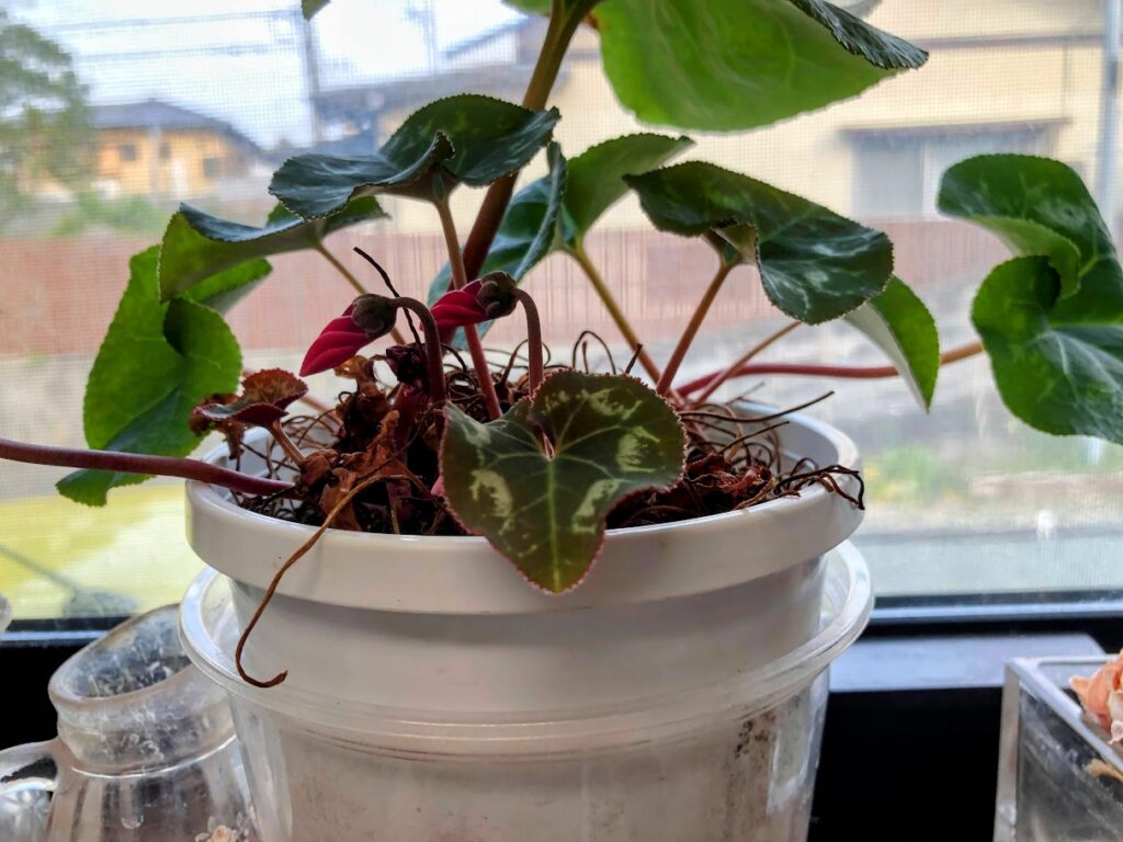それはそうと、例のシクラメンは、今朝見直したら、いつの間にか花のつぼみが二つに増えてた。すごい。ここまでよみがえったか。