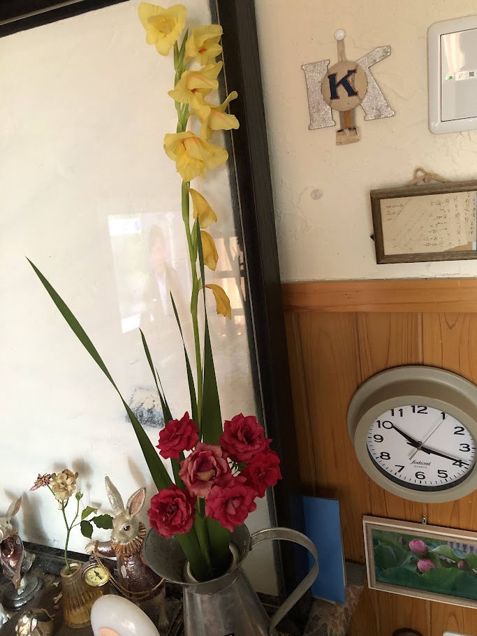 グラジオラスが、あれっきりなかなか咲かない。つぼみも見えない。これはちょっと、あてがはずれた。でも、終わりかけの散る寸前のバラを熱波の中から救い出して、添えてみたら、これはこれでよくなった。何だか、我流の生け花をしてるみたいで、自分で笑っちゃう。