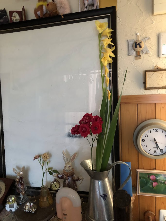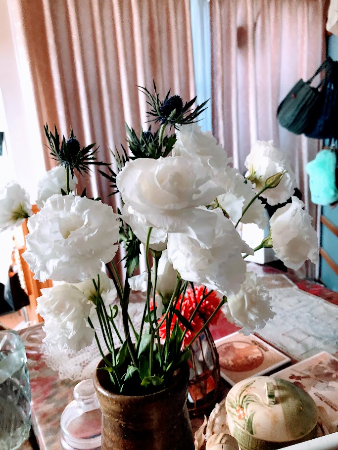 昨日買った白いトルコ桔梗、きれいなんだけど、ちょっとめりはりをつけたくなって、今日はエリンジウムを一本だけ買って来て加えてみた。悪くないけど、もう一本あってもよかったかな。