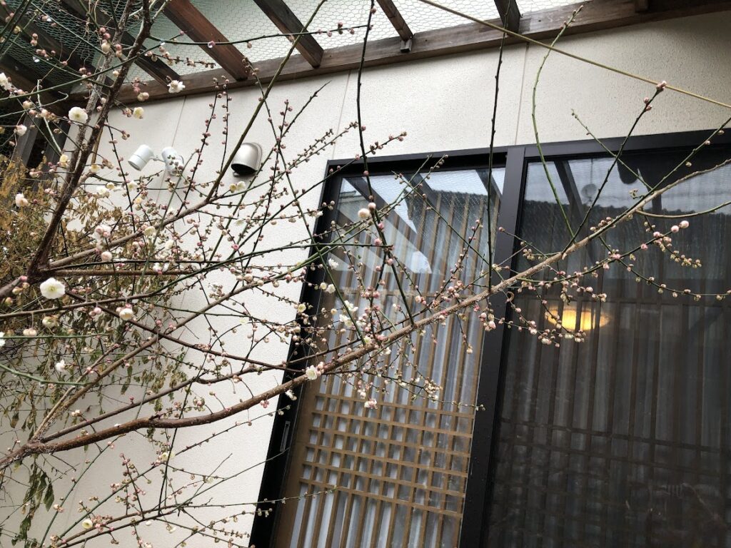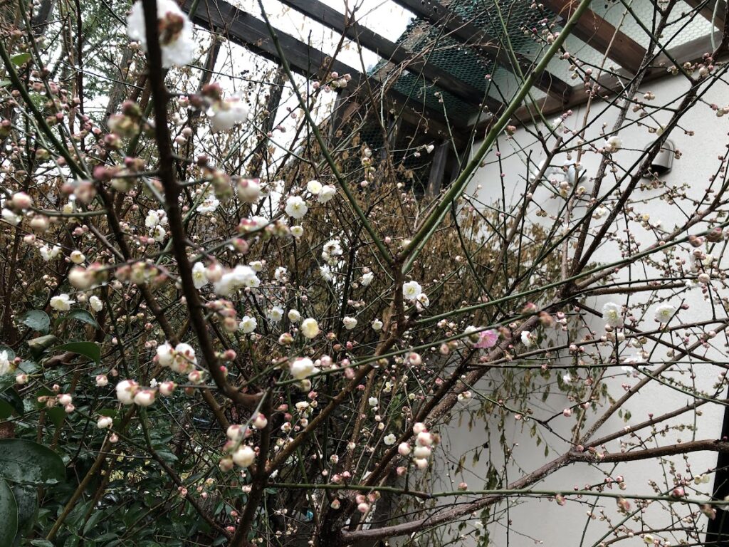 近所の家々ではいろんな梅が満開だ。うちの庭のは日陰なので、咲くのが遅くて、まだちょっとみすぼらしい。それでも今年は枝を刈り込みそこねたのが怪我の功名で、そこそこ豪勢に広がっていて、もうちょっと楽しめるかな。