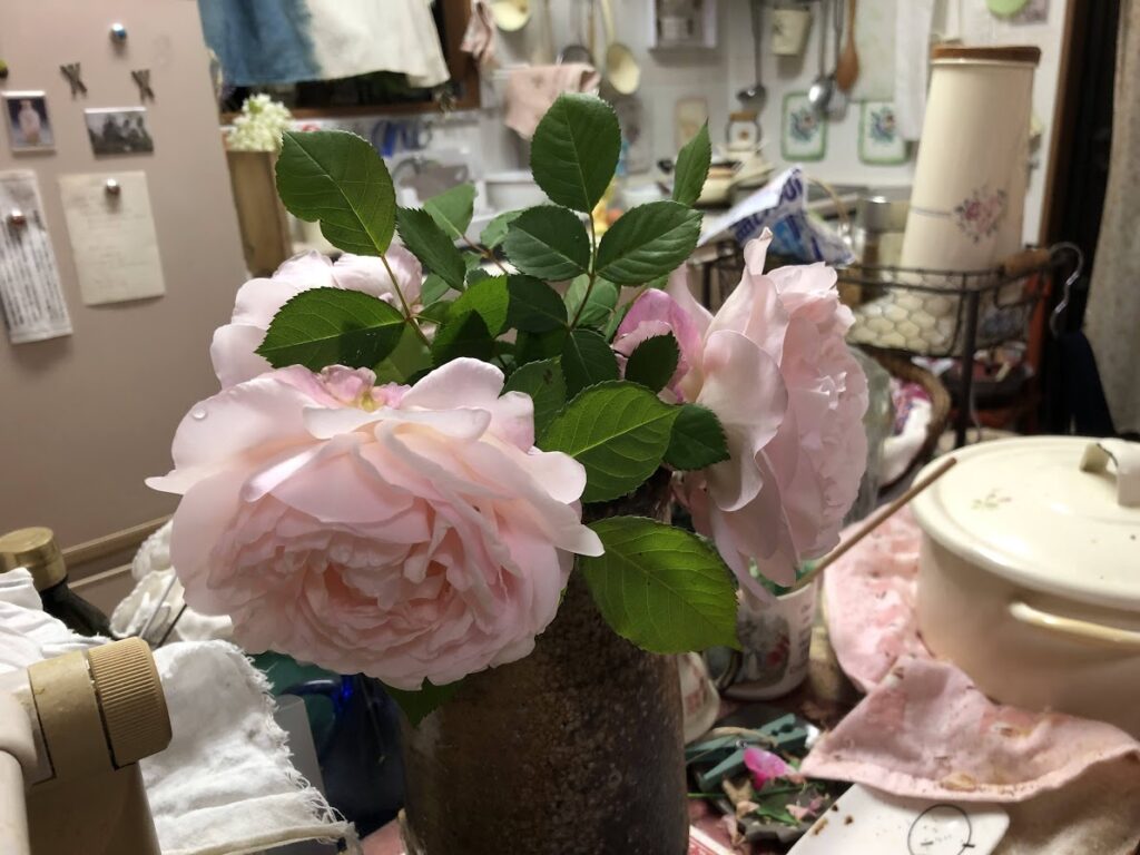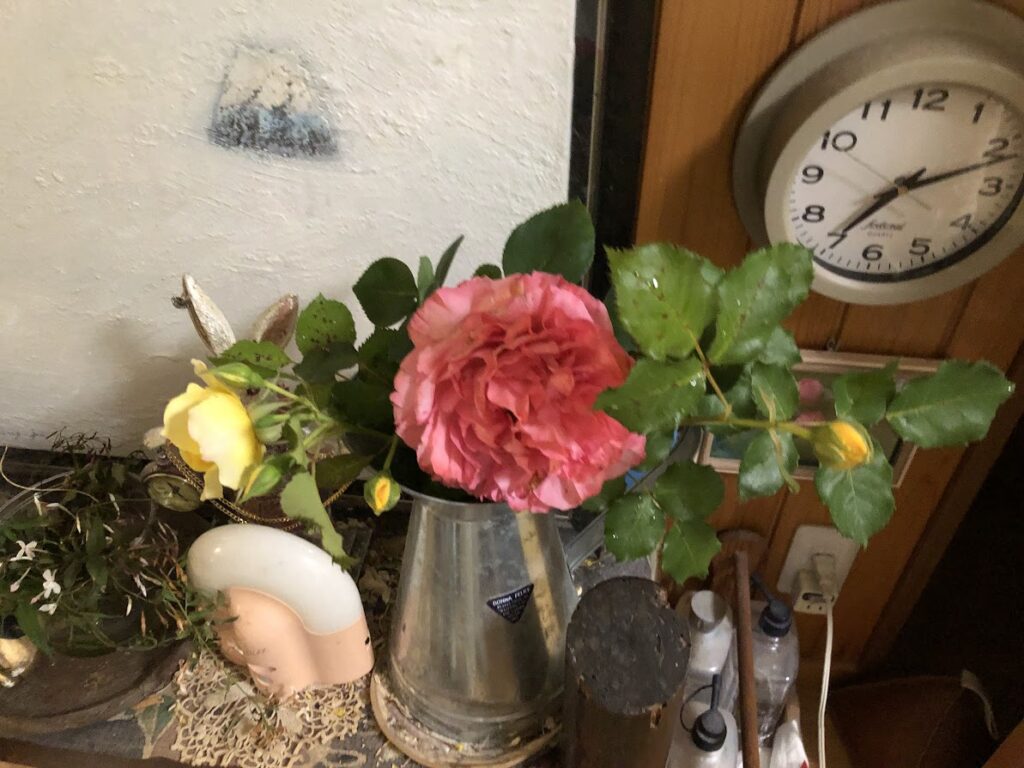 手のひらほどもありそうな、大きなバラが部屋にあるのは、妙に楽しくうれしいものと気がついて、今日それも散りかけたので、茎を切って鉢に挿し(運がよければ根づくだろう)、奥庭から新しい巨大なバラをまたいくつかつんで来た。庭にあっても楽しいが、部屋にあると本当にパワーが放たれているようで快適ったらない。きちんとしたお花屋さんのではなく、きれいに花瓶におさまらず、どことなく荒くれてのたくっているのがまた何となくいい(笑)。
