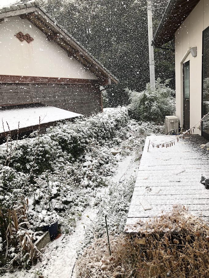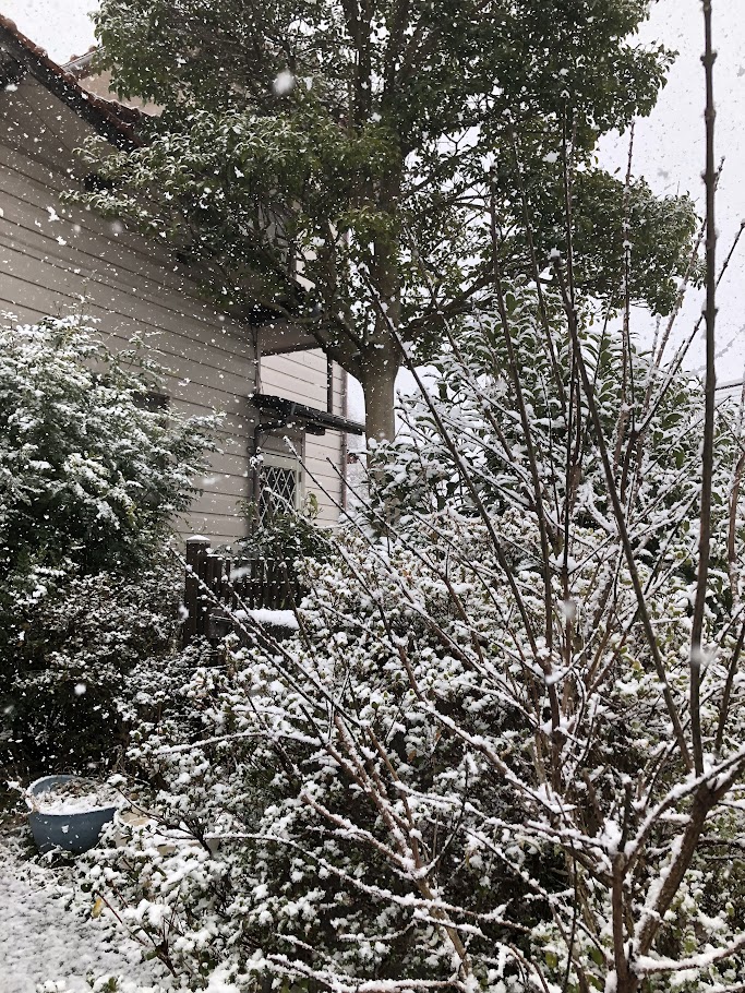 朝から、ふわふわ雪が降ってる。葉っぱが落ちて枯れ枝だけになってるように見えて、ちゃんと芽がついているのかしらと私を冷や冷やさせている、上の家の玄関前のユキヤナギも、こんな状態で、みごとに花が満開のようだ。ユキヤナギが雪柳してるのだから世話はない。