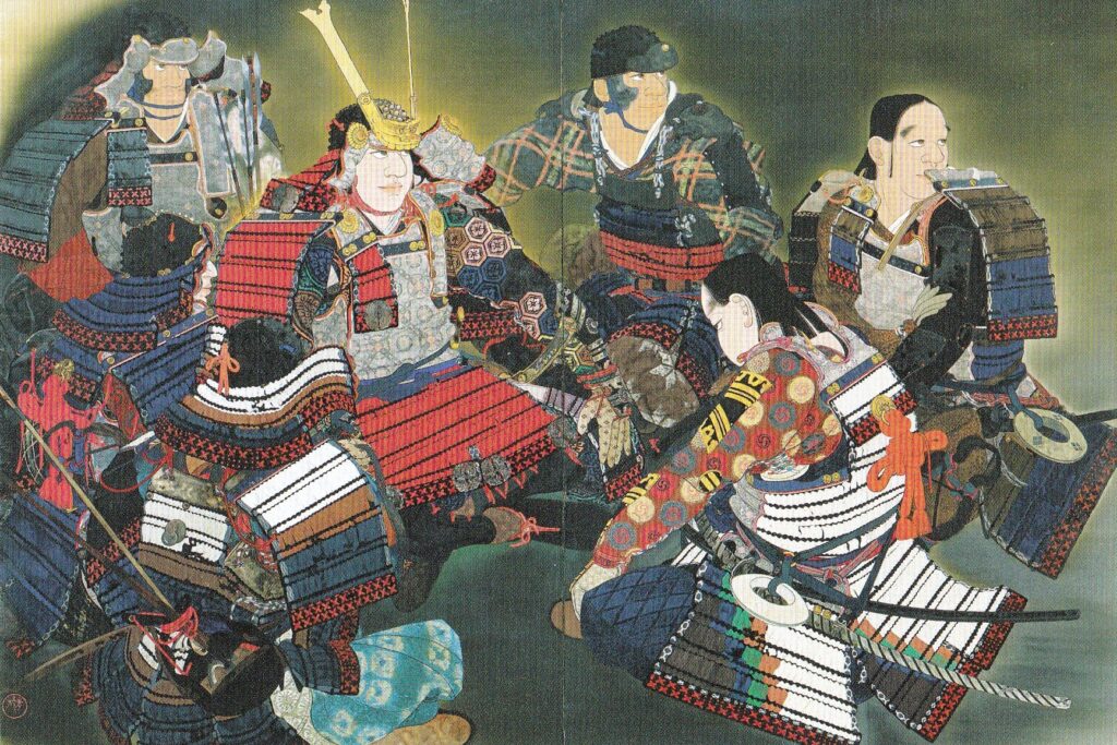 3)前回の授業で話した、平家への戦いを始めてすぐ敗戦して逃亡中、大木のうろに隠れた源頼朝主従を描いた絵です。(前田青邨「洞窟の頼朝」)