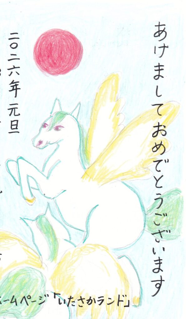 年賀状は何とか作ったんだけどね。大昔の絵葉書をもとにして、背中に羽をつけてペガサスにしたんだけど、できあがったのを見たら羽が小さすぎて、馬はそこそこ太ってるから、この羽じゃ持ち上がりそうにないんだよね。まあいいや。