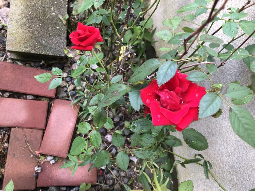 ここ数日の雨で、庭のバラがかなり傷んでしまったが、それでも元気に咲き続けている。裏の擁壁に広がった甲子園もどきのツタを背にして、なかなか真紅が映えている。