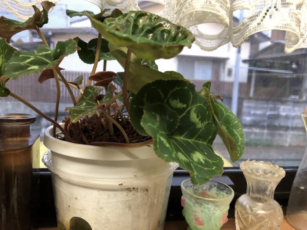 この小さい家を母の隠居所として建てたとき(結局母はすぐ老人ホームに入って、ほとんど使わなかったのだが)、お祝いにもらった、小さなシクラメンの鉢は十六年経ってもまだ元気だということは、前に何度か書いた。キッチンの窓辺に置いて毎日水をやっているだけなのに、何度か虫もついて葉っぱも枯れてすっかりなくなったりしたのに、また復活して元に戻る。