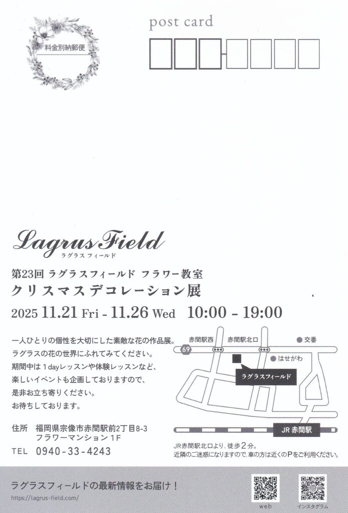 よく行く花屋さんが、例年のクリスマスリースの展示会をなさるようだ。毎年どんどん皆さんの腕が上がるので、ほんとに年末の目の保養になる。このハガキを作ったのは、私のパソコンを管理して下さってるデュナミスライフさんで、これがまた素敵だ。