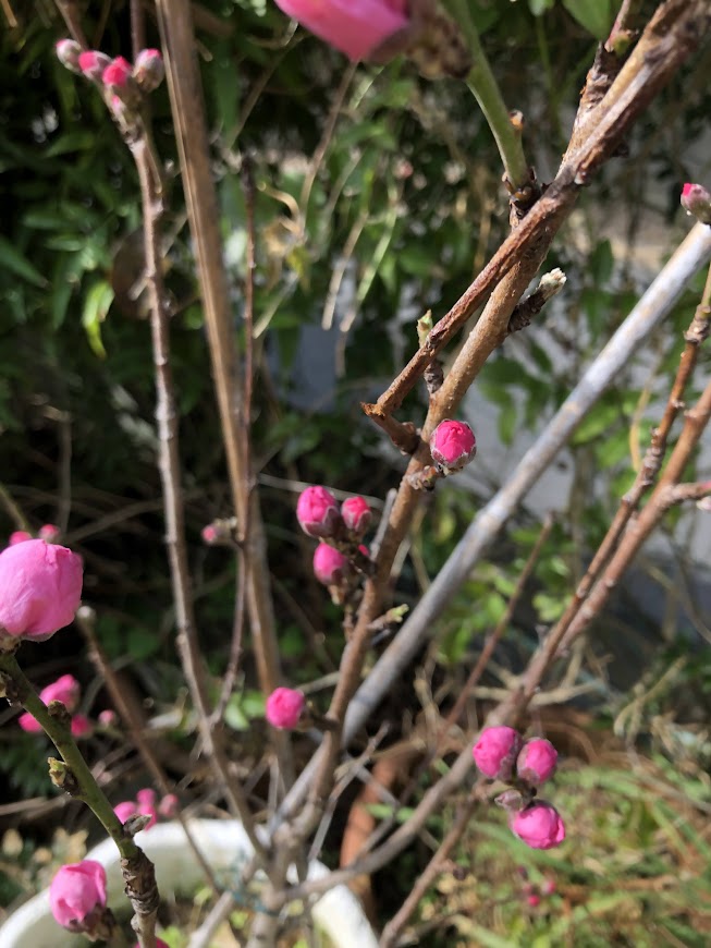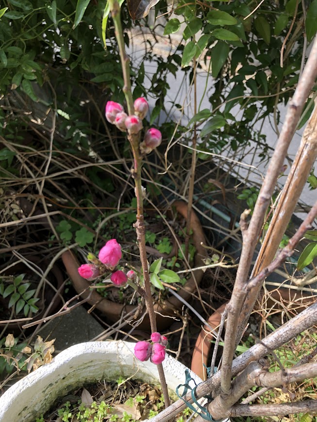 頭をかかえてだらだらしてたら、何とまあ生きてる気配も見せなかった、表庭の鉢に植えっぱなしの桃の木に、いきなり鮮やかな色の花が咲いた。しかも、ジャスミンの茂みにかくれて、道からも隣からもまったく見えない、私だけのためみたいな場所。うれしいような申し訳ないような。植物ってほんとにけなげで律儀だなあ。