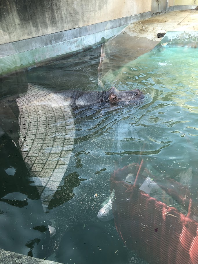 いりぐちちかくに、「かば」がいて、さいしょは、みずのなかにしずんで、