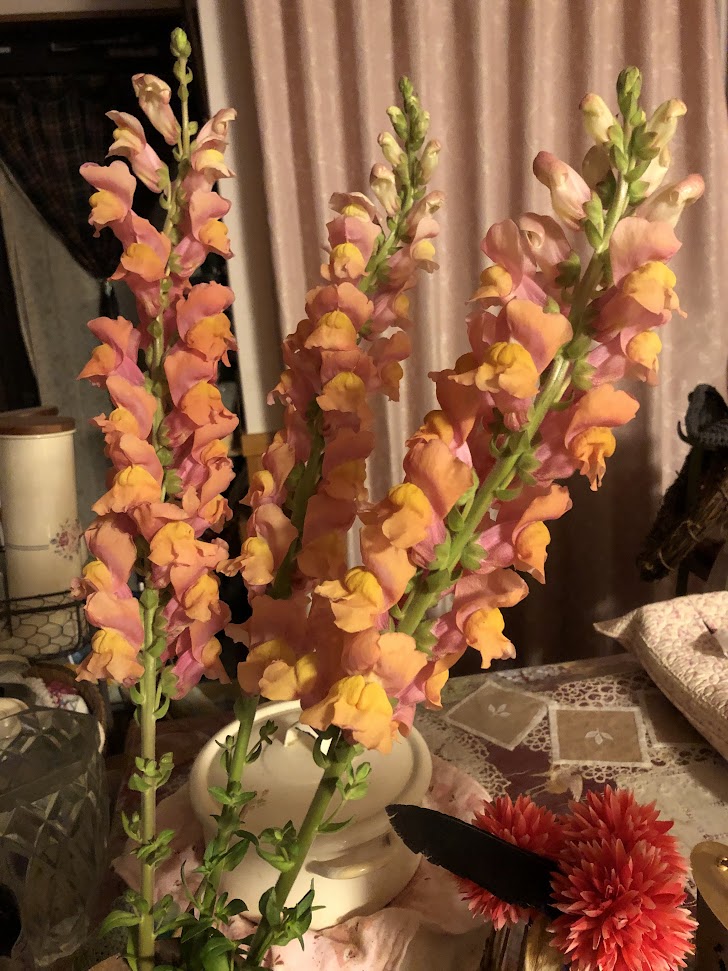 花屋さんで妙に金ピカで豪勢なキンギョソウ(私はこれとストックとの見分けがまだつかない)と謎めいた風情の紫のアンスリウムを買ってきて飾った。読書会で参加者の方が「ブログの写真で拝見すると、とてもきれいなおうちですね」と言われるから、「それが、写真の画面の枠内だけで、その外はもう地獄です」と申し上げたのだが、謙遜でも何でもなくこれはほんとにそうなのだから、一刻も早く何とか、写真の画面の周囲も見られるようにしなくてはいけない。