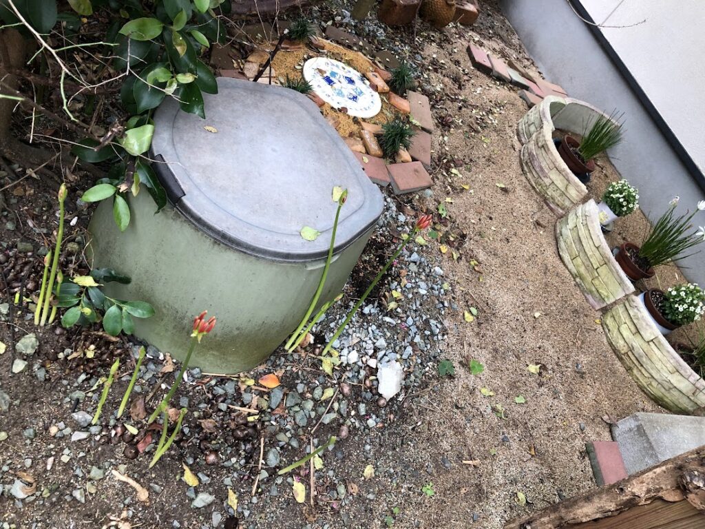 彼岸花がやっと少し咲き始めた。雑草の中、何だか、けなげ。