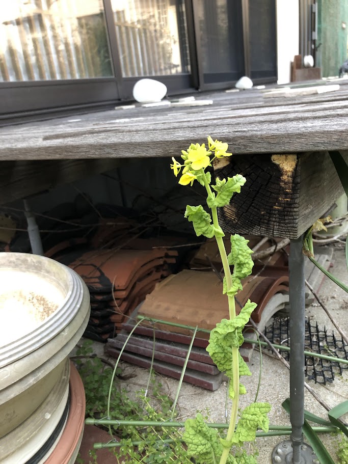 最近昼近くまで寝る癖がついて、これではいかんと、今日は少しは仕事をしました。ベッドの回りに山積みになってた紙類を処理処分し、確定申告関係の書類もだいたい片づけました。お風呂に入ってすっきりし、あともう一つ、世にもおろかな失敗の後始末を何とかしたのですが、これはまあ、また明日にでもご報告を。庭では椿が咲き乱れ、フリージアもジャスミンも咲き出しそうな気配。桃の小さい木も今ごろつぼみをつけ、わずかに残ったアネモネが、鮮やかな赤い花を開いています。この写真はそんな中で、一時期全盛だったのですが今は滅びて、一本だけになった菜の花。