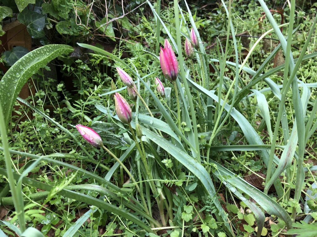 雨がほどよく降ってくれるのは助かりますが、なかなか草取りをするチャンスがない。ろくな手入れをしていないのに、バラは皆元気に伸びまくり、モッコウバラはもうそろそろ花盛り。キナモチの若葉も下からはっきり見えるようになって、今朝はどこから来たのやら、立派なカチガラスがとまっていました(笑)。ユキヤナギも刈り込まれた分、勢いを増してはびこり、鉢に植えっぱなしのカーネーションにも、いっぱいつぼみがついている。