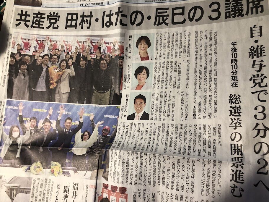 今朝、燃えるゴミ出しのついでに郵便受けをのぞいて「しんぶん赤旗」を取ったら、目を疑った。田村智子委員長とともに、はたの君枝、辰巳コータロー両氏も当選でバンザイしている写真が一面を飾っている。