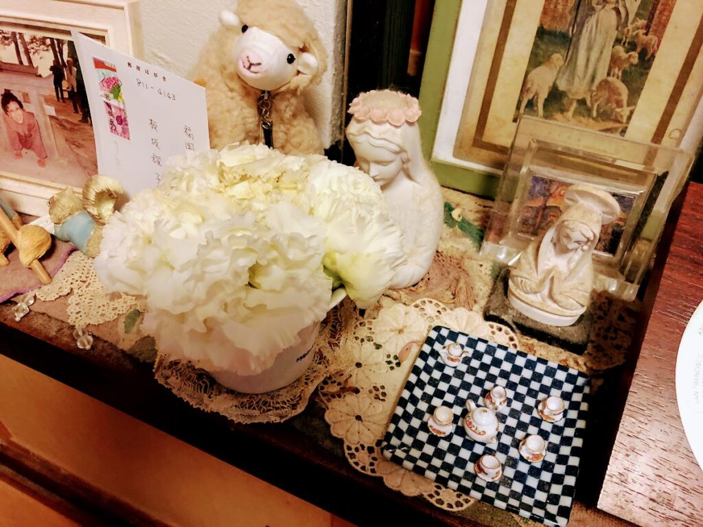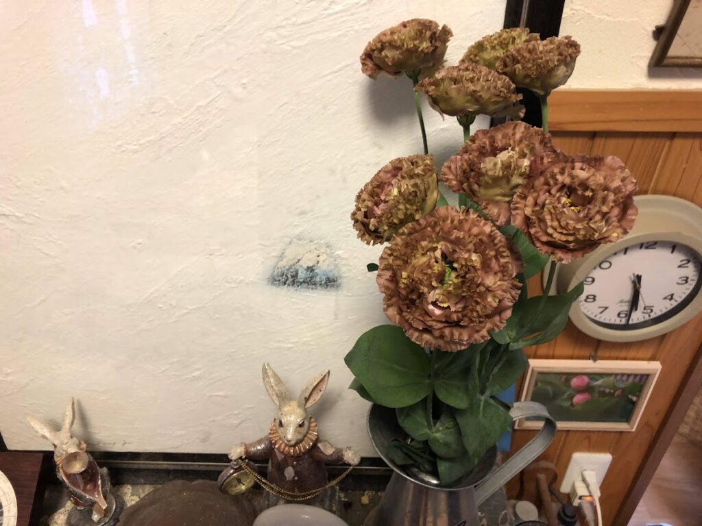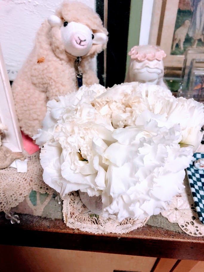 白いトルコ桔梗もまだ花はきれいなので、短く切って飾りました。かき氷みたいで、いいでしょう?(笑)