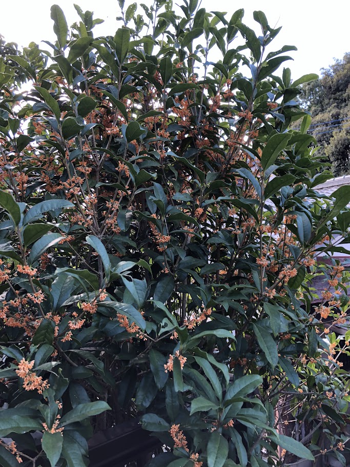 垣根代わりに、家を建てたとき最初に植えたキンモクセイも、いつもは適当に刈り込むのだが、今年はバテて、放っておいたものだから、手のつけようもないほど、ぼうぼうに伸びている。でも、それがまた、怪我の功名といおうか、これまで見たことがなかったほど、満開の花が、庭中にいい香りをただよわせている。