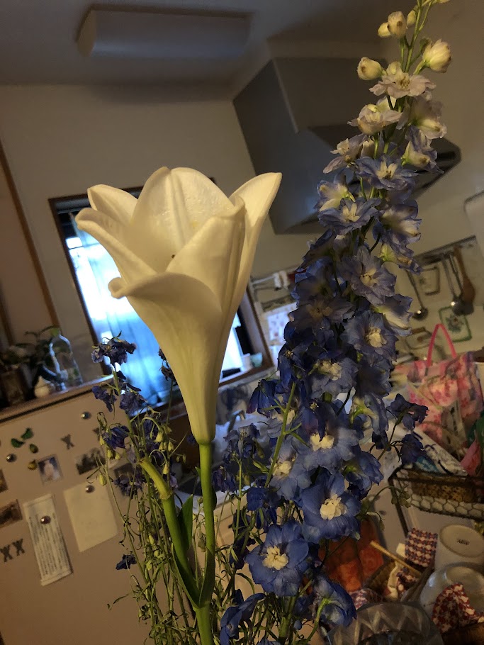 最後の最後になりそうなユリを切ってきて、少し元気のなくなったけどまだきれいな青い花ととりまぜて飾りました。青い方の一本はトルコ桔梗とまぜました。ほんとはどの花も、もうちょっと短く切った方がかっこよく飾れるんでしょうが、なかなかその決断ができない。