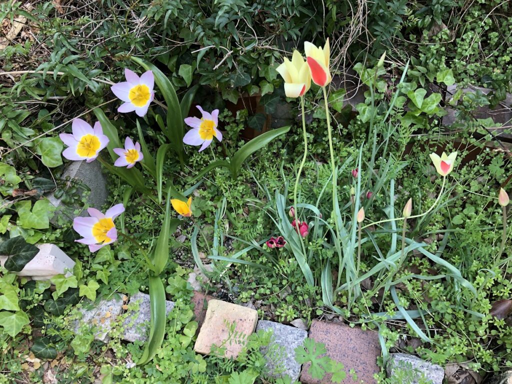 庭ではとうとう雑草の中にチューリップまで咲き始めました。朝のきれいな時に撮ってやろうと思いながら寝坊してしまうので、ぱかっと開いた姿しか撮れなくてごめん。夕方になったらまたちゃんと、つぼむんですけどねえ。