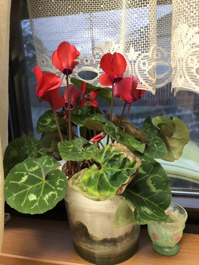 写真は、すっかり花も盛りとなった十六年目のシクラメンの鉢。枯れた葉っぱを取ってやらなくちゃいけませんねえ。
