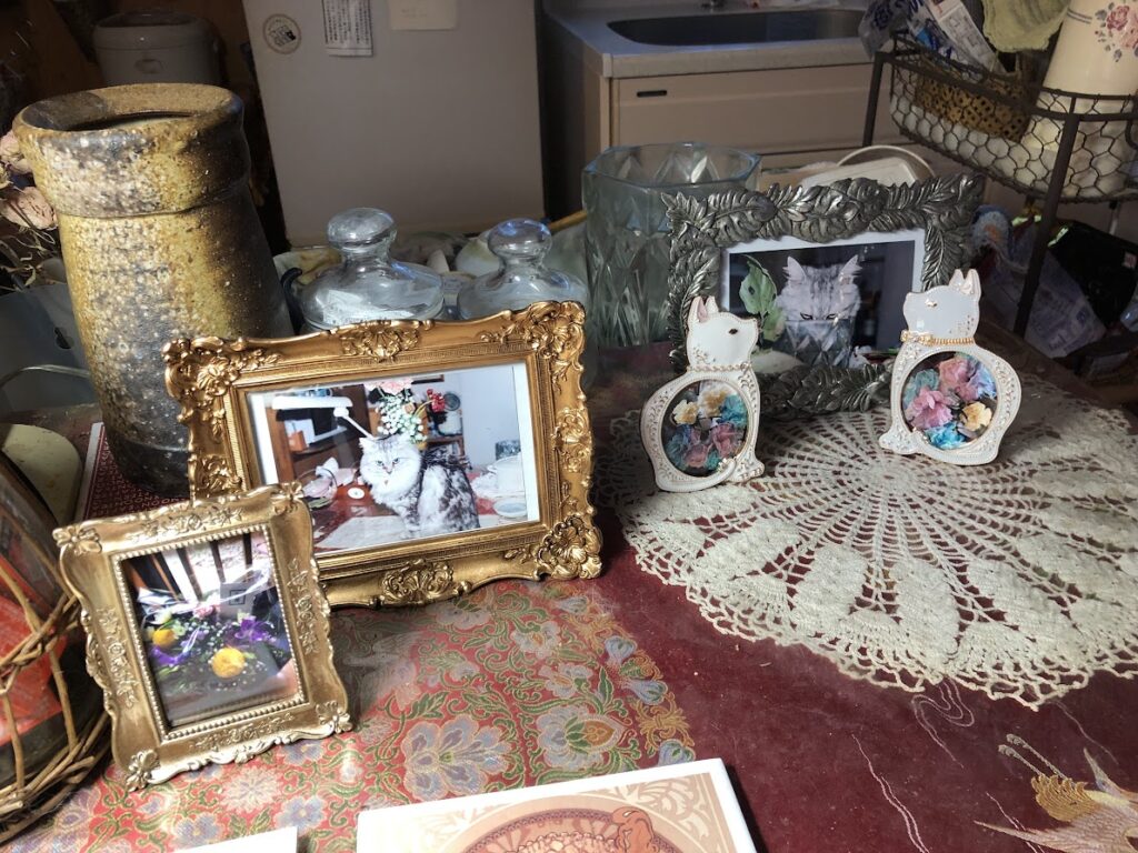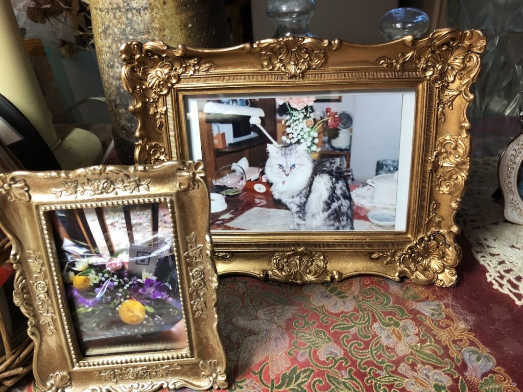 とにかく今は、彼の写真をあちこちに飾っている。死んですぐ、何だか動揺して、アフタヌーンティーでしゃれた写真立てを注文してしまった。届いたらめちゃきれいで、うれしかったが、これに猫の写真を入れるとくどいような気がして、彼を葬るときにいただいたお花の写真を入れることにした。他の方からいただいたお花も並べて写真を飾った。