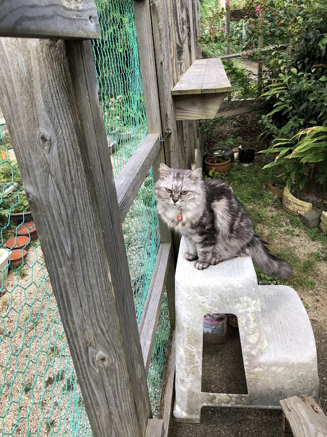 正面右奥に見える踏み台の上に、カツジはよく座って私の帰りを待っていたり、庭に出て仕事をするのを見守ったりしていました。私が上の家で仕事をしていると、気にくわないのか、にゃあにゃあ呼んだりしました。それを思い出すとなかなかこの踏み台も位置を変える気にはなりそうもない。
