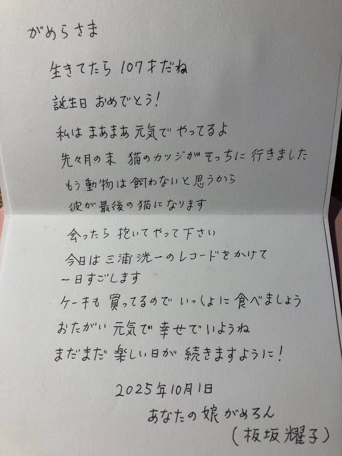 生きているときの名残りで、ついバースデーカードを書いて、ケーキを食べて、母が好きだった三浦洸一さんの曲を一日中流して、お祝いしました。まあ命日にも同じことをやるんですけどね。なお、「がめら」と「がめろん」は、母と私がつけあっていた、あだ名です。